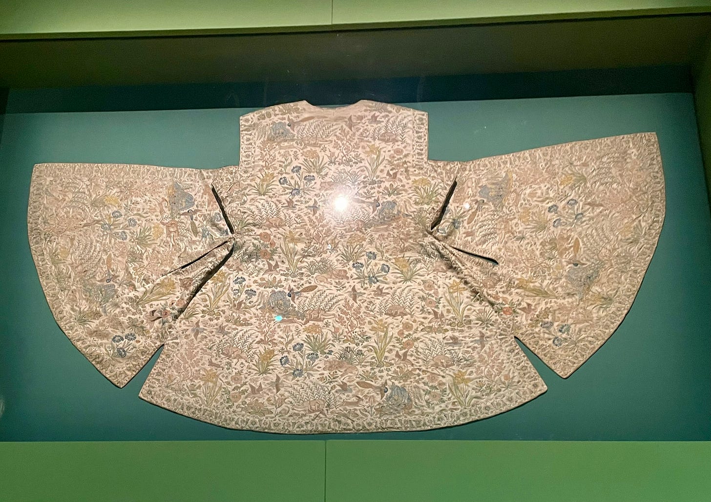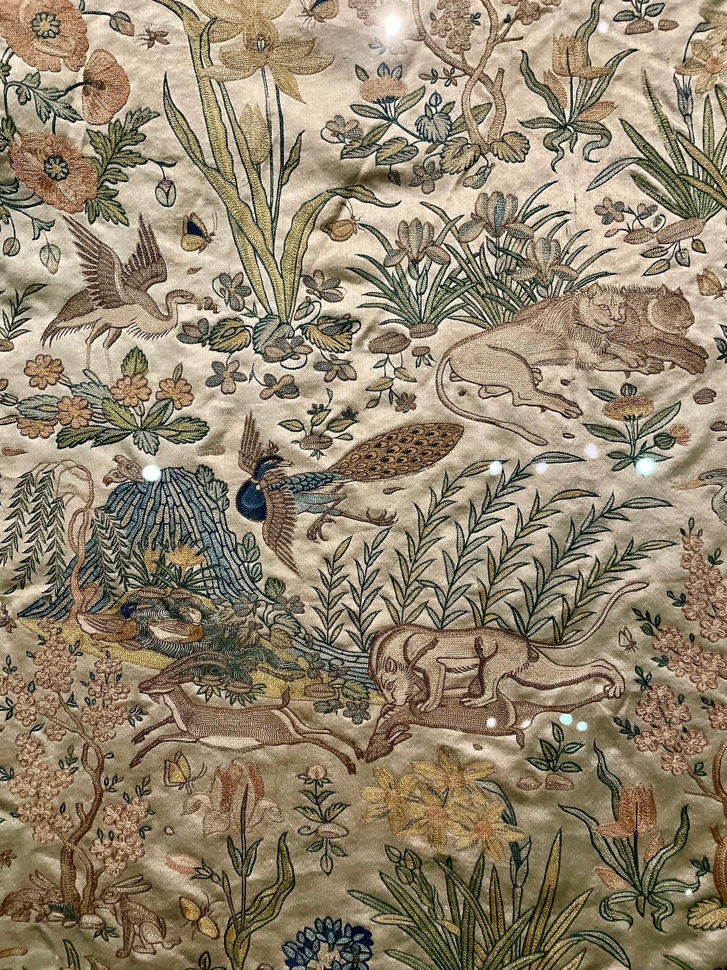 The next era is the reign of Jahangir, this section points to the journeying nature of the Mughal Court and the interest in nature and hunting, not much different to European courts then! I loved the depth of embroidered detail on this hunting coat, a safari all of its own, there are animals, birds, plants, flowers, it’s hard to see the effect on the full coat but the close up pictures give you some idea of the intricacy of the needlecraft.