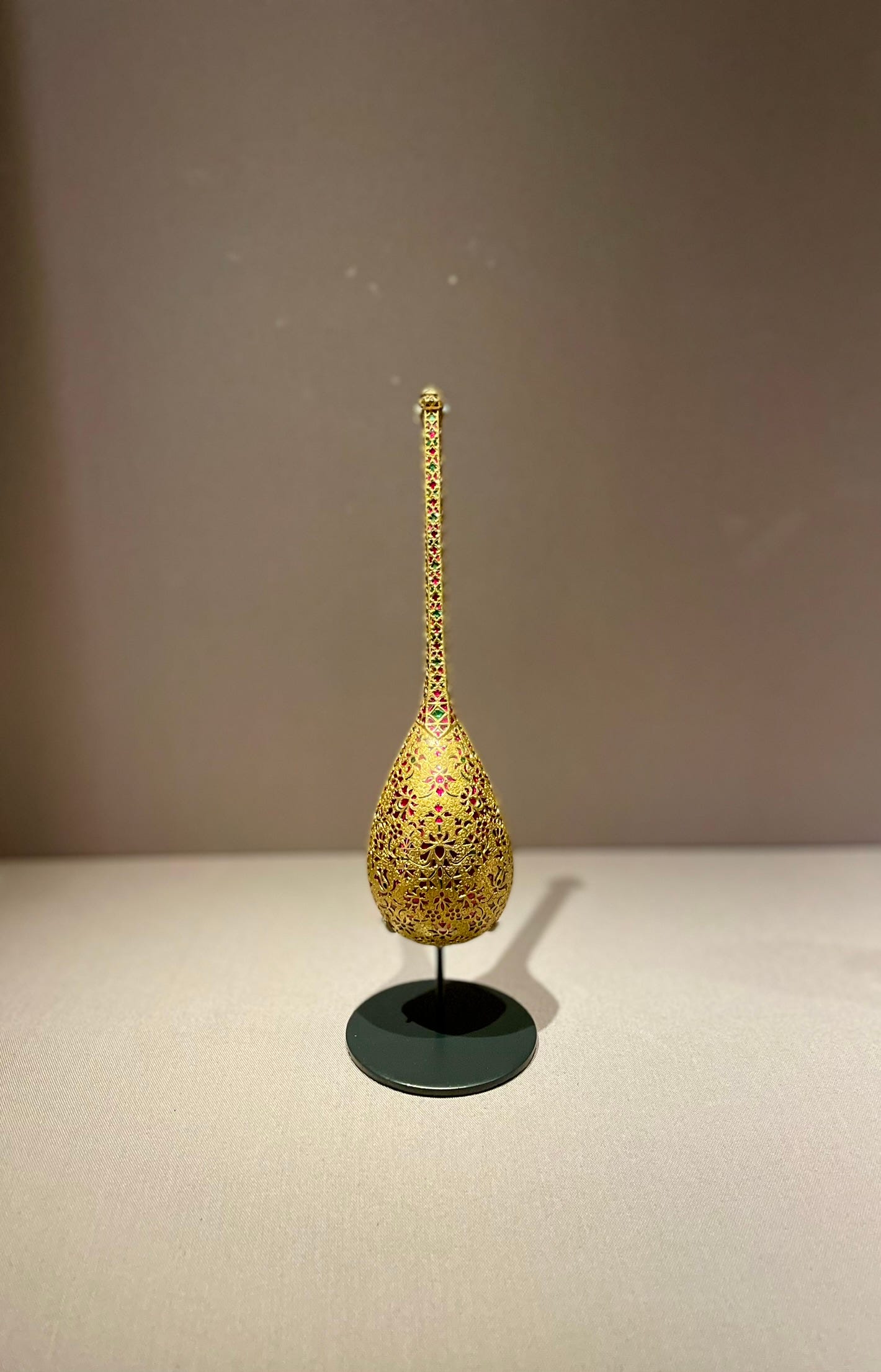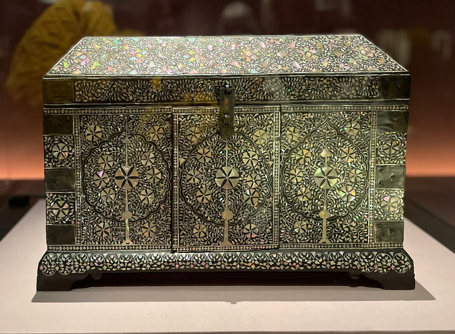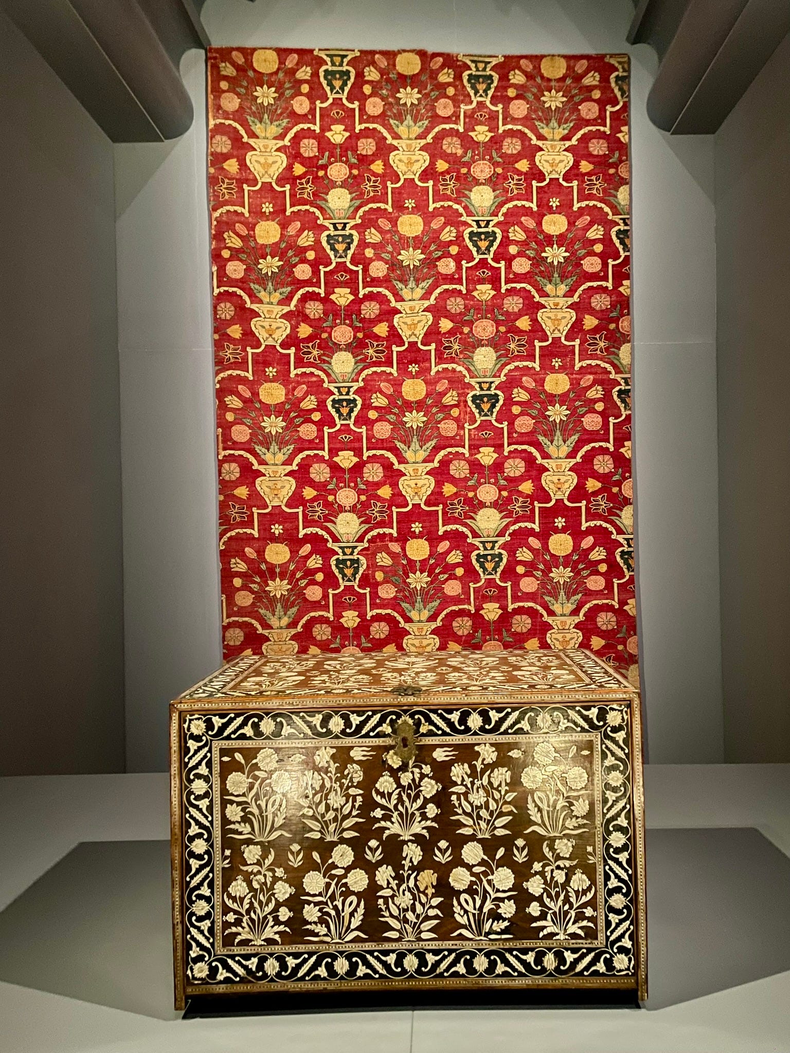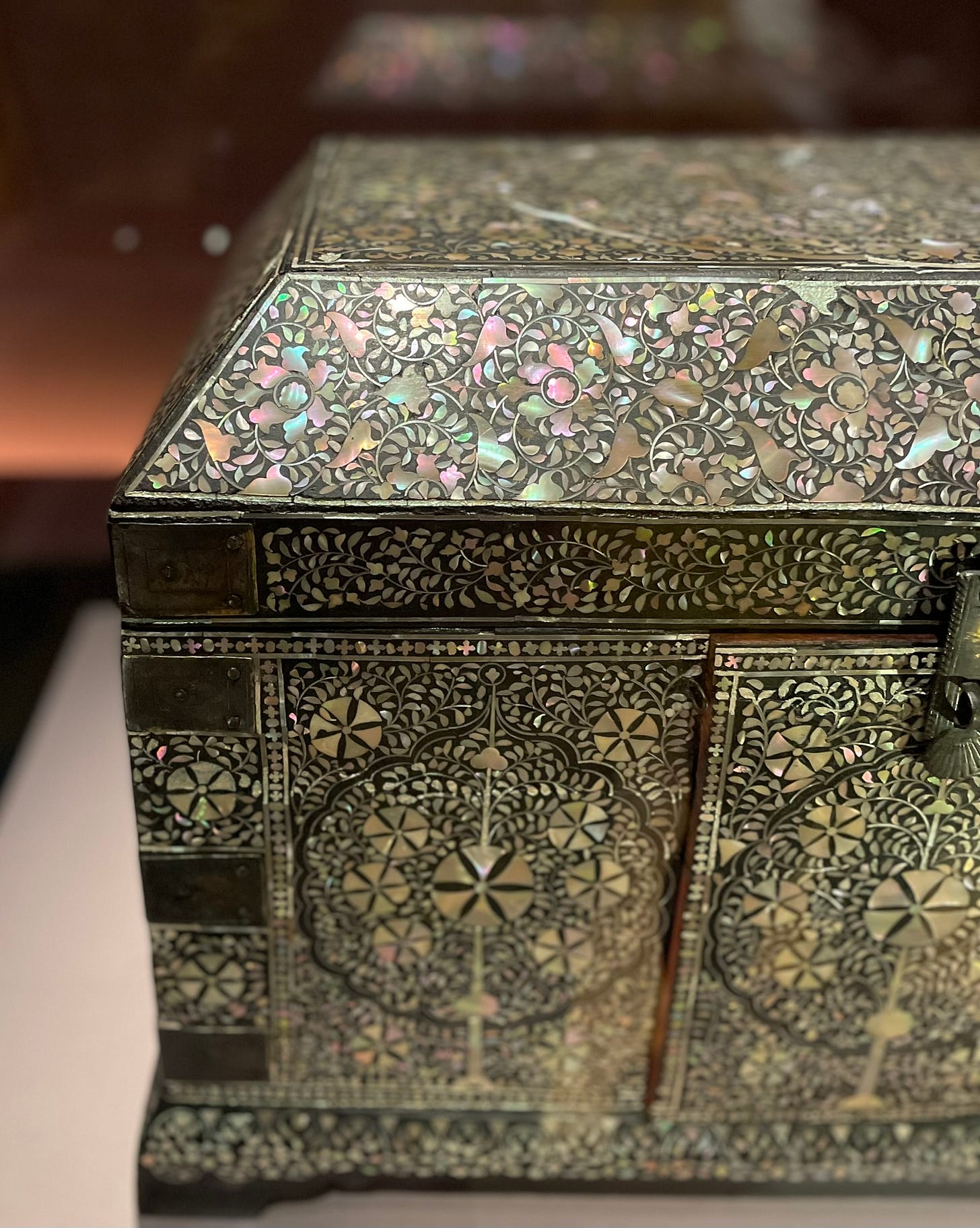 There are bejewelled ceremonial items as well, this spoon is covered in emeralds and rubies with a gold foil, look at those intricate patterns, amazing goldsmith’s work. Similarly, there are caskets worked with mother of pearl giving multicoloured luminescent adornment, what’s interesting about these is their use in this altar frontal which has Christian narratives such as cherubs and angels. Goa was a centre of Jesuit missionary work so it’s interesting to see religious artifacts expressed through the artistic media of the Mughal Courts.