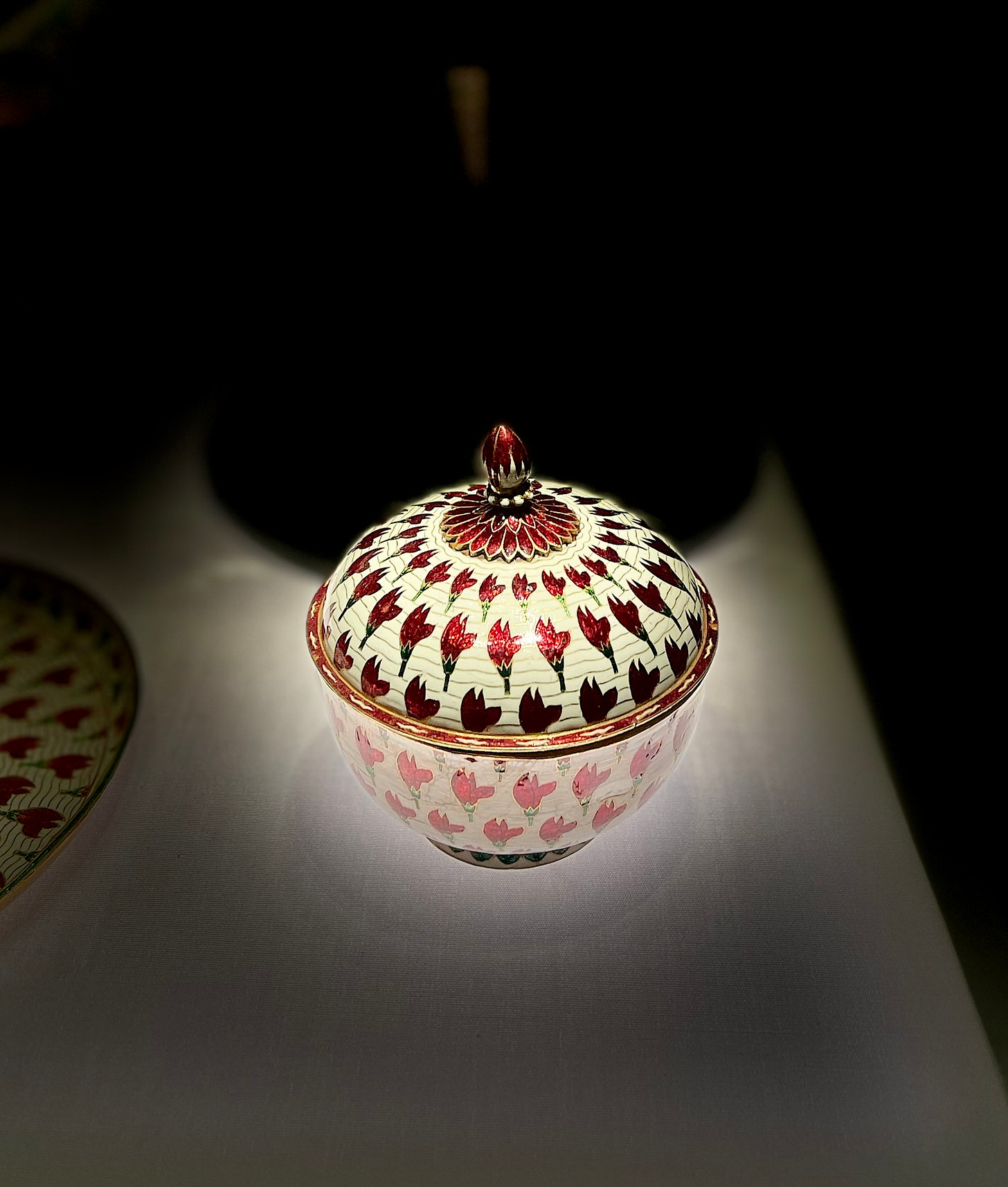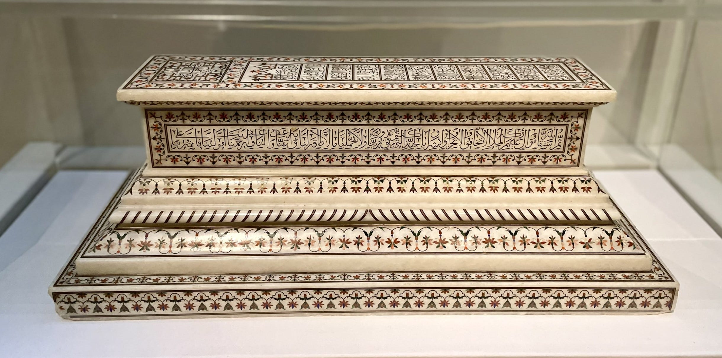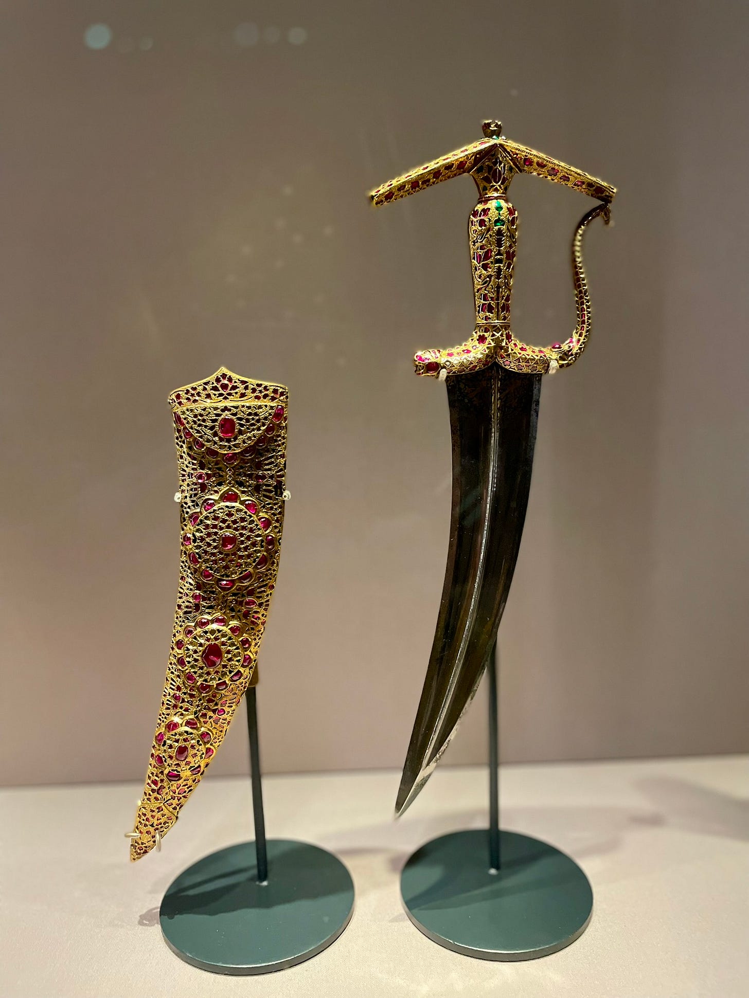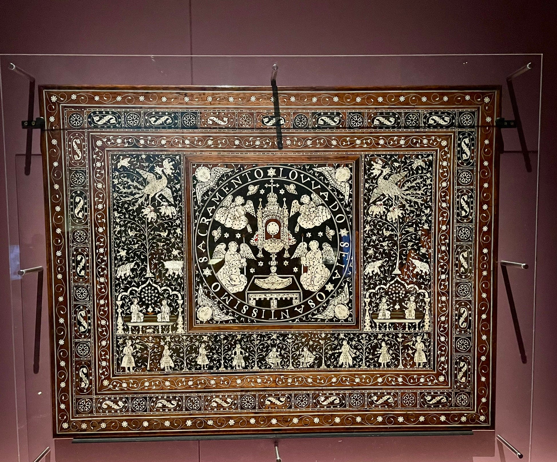 There are bejewelled ceremonial items as well, this spoon is covered in emeralds and rubies with a gold foil, look at those intricate patterns, amazing goldsmith’s work. Similarly, there are caskets worked with mother of pearl giving multicoloured luminescent adornment, what’s interesting about these is their use in this altar frontal which has Christian narratives such as cherubs and angels. Goa was a centre of Jesuit missionary work so it’s interesting to see religious artifacts expressed through the artistic media of the Mughal Courts.