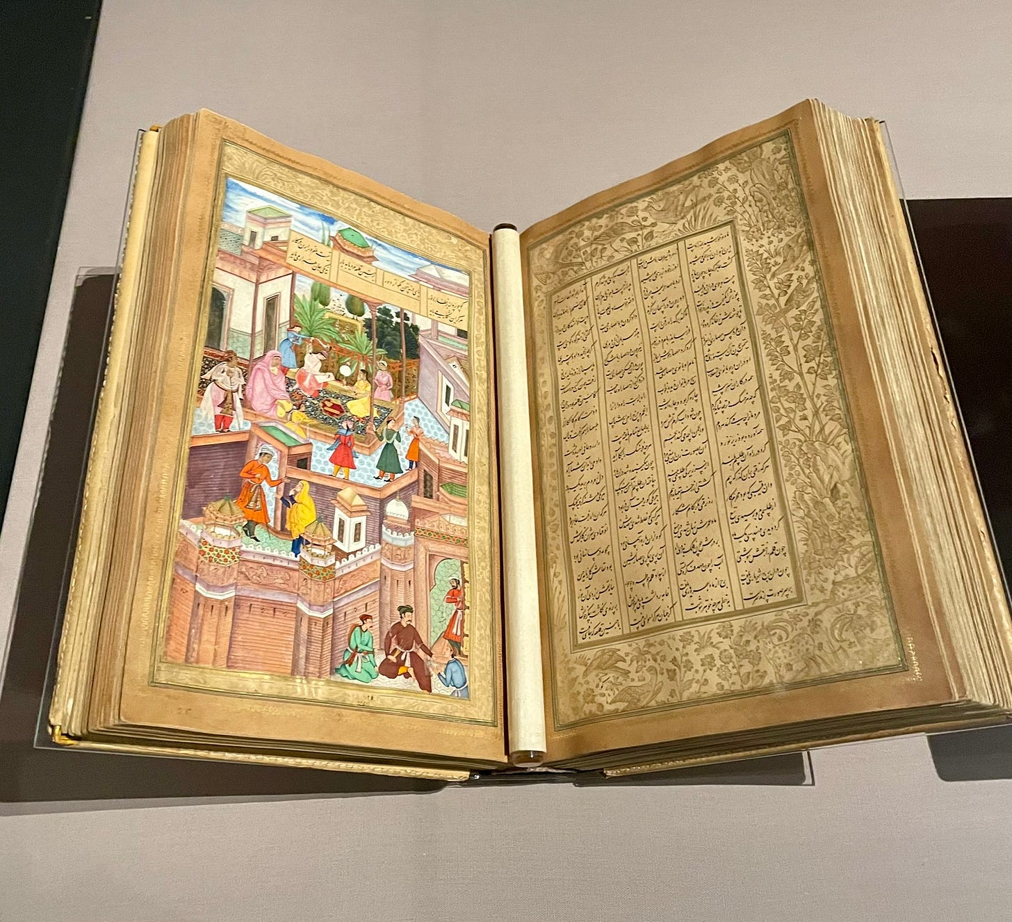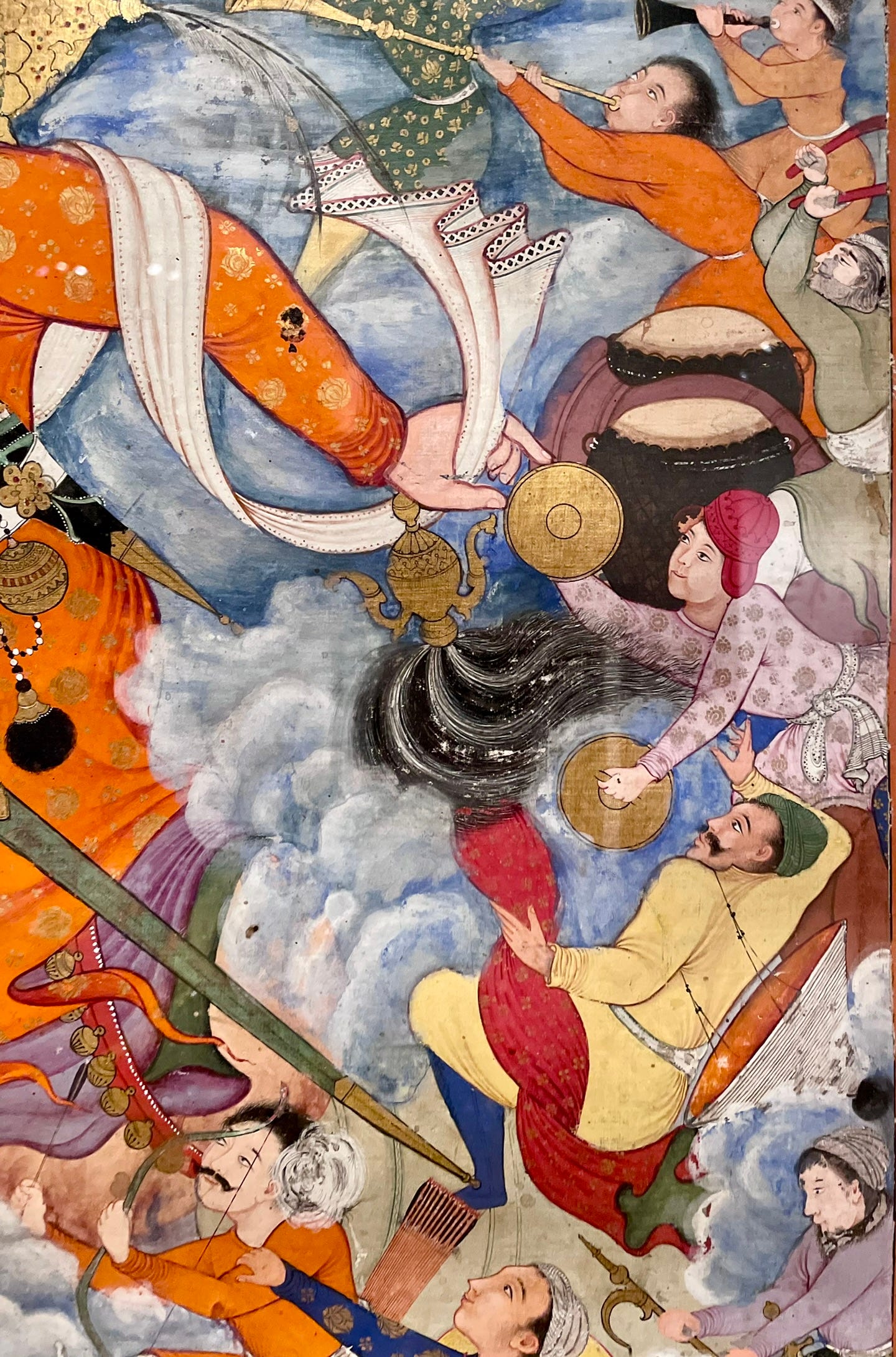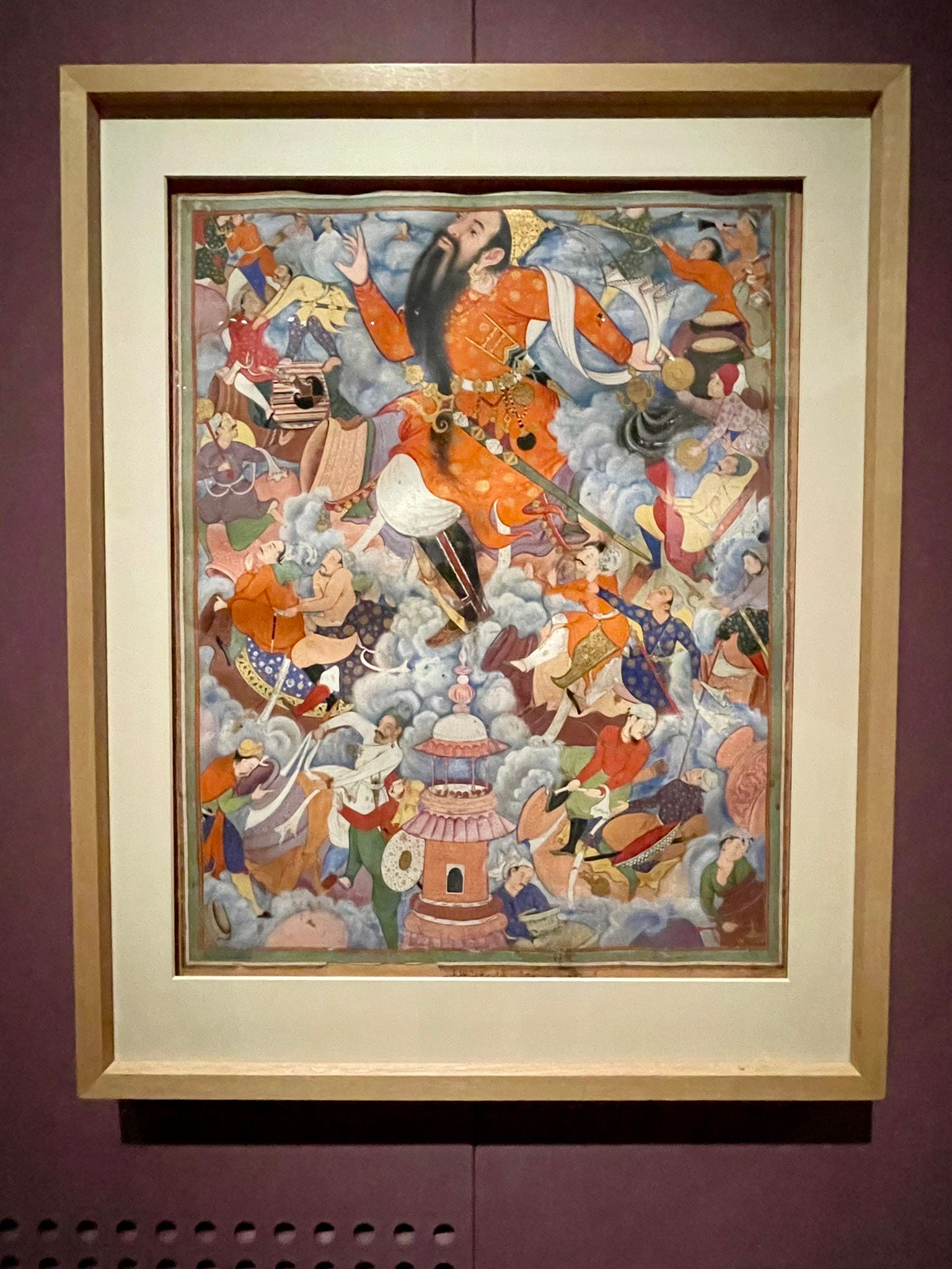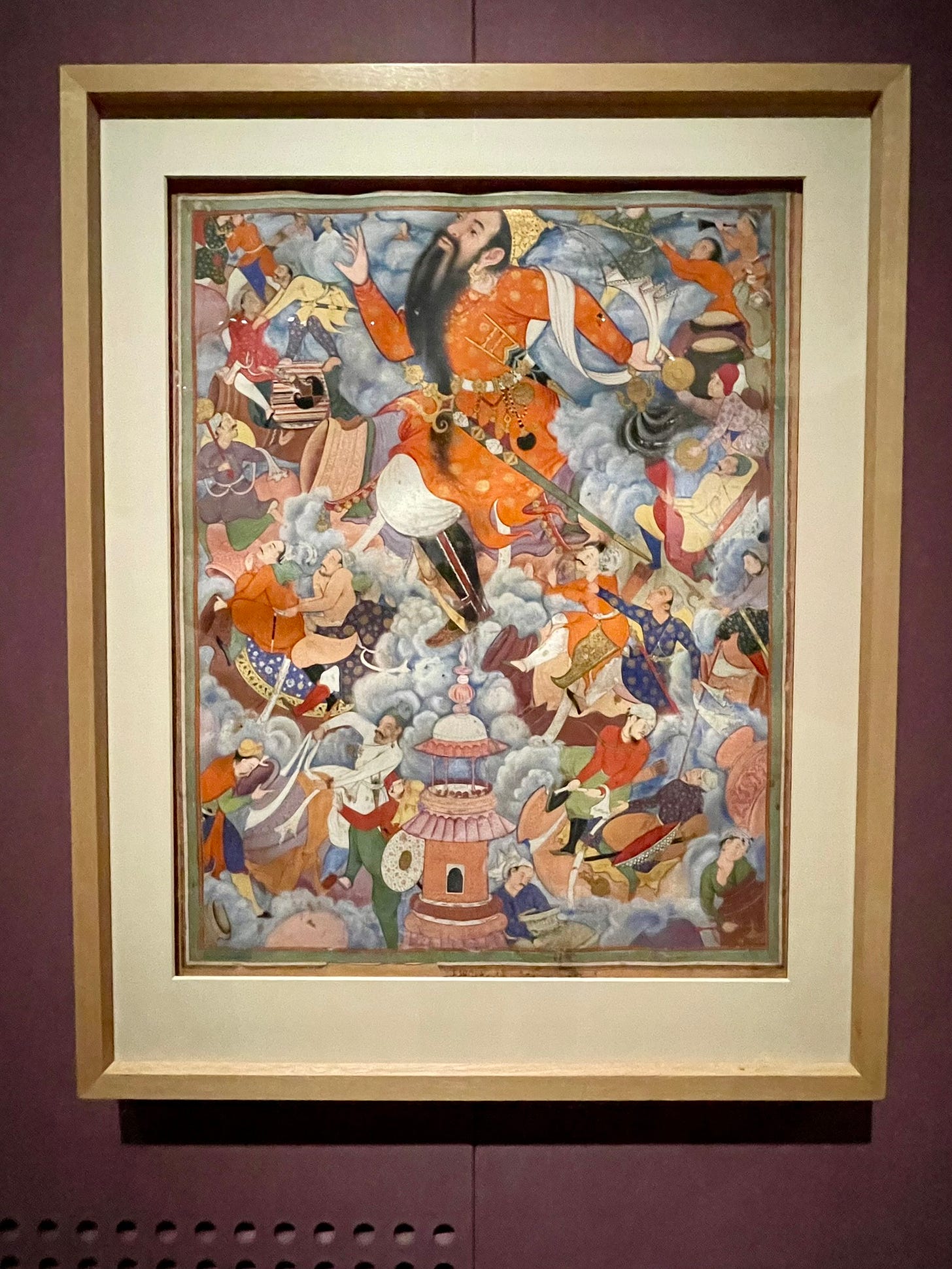 This is an illustration from the manuscript The Hamza-Nama, it shows the mythical giant Zumurrud Shah fleeing from Amir Hamza, a legendary Muslim warrior. The colours are incredibly fresh and vibrant, it’s also highly detailed, I can’t help but think of illuminated bibles. Some illustrations have been taken out and framed as individual artworks but there were also full books on display, with illustrated pages and written texts, they’re beautiful pieces.