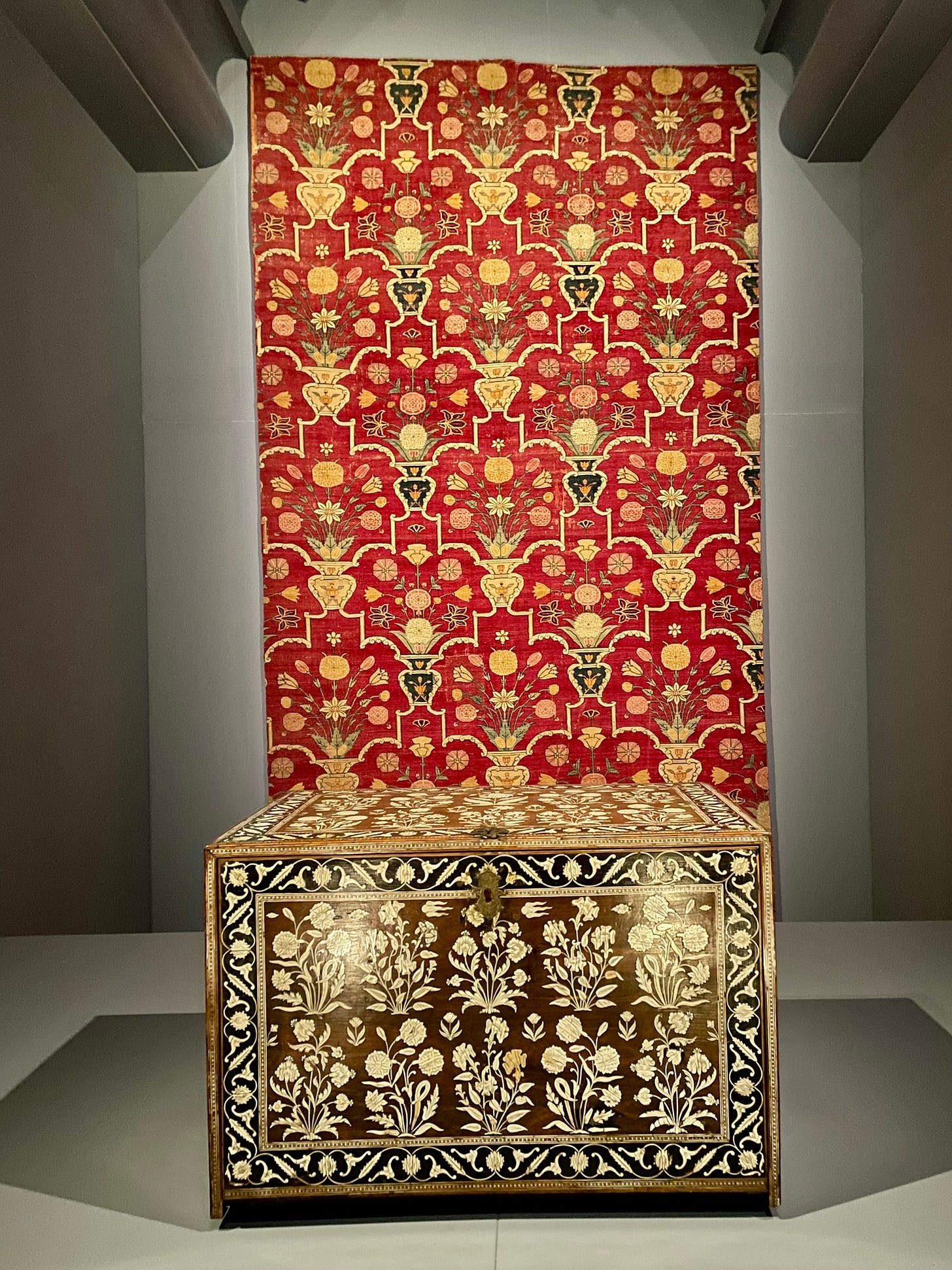 This is a large exhibition, the linear tracing of the three eras under different rulers helps to get an understanding of the development of arts within the Mughal courts. I got a sense that the Arts leap from within the pages of illustrated books and ceremonial items to embellish a wider range of items across the courts by Jahan’s rule but that may be my imagination! Exhibitions such as this one, Silk Roads and A Silk Road Oasis are starting to lift the lid on Art Histories beyond the Western Cannon, more so, they are shining a light on the interconnectivity between influences on the Arts through global trade and collaboration. Which brings me back to the Museum Café, created in the Arts and Crafts era, William Morris had a hand in the decoration, influences from the Mughal Courts can be seen, the flattened flowers, the saturation of detail, the richness of the colours are all there, in a different form but there, what do you think?